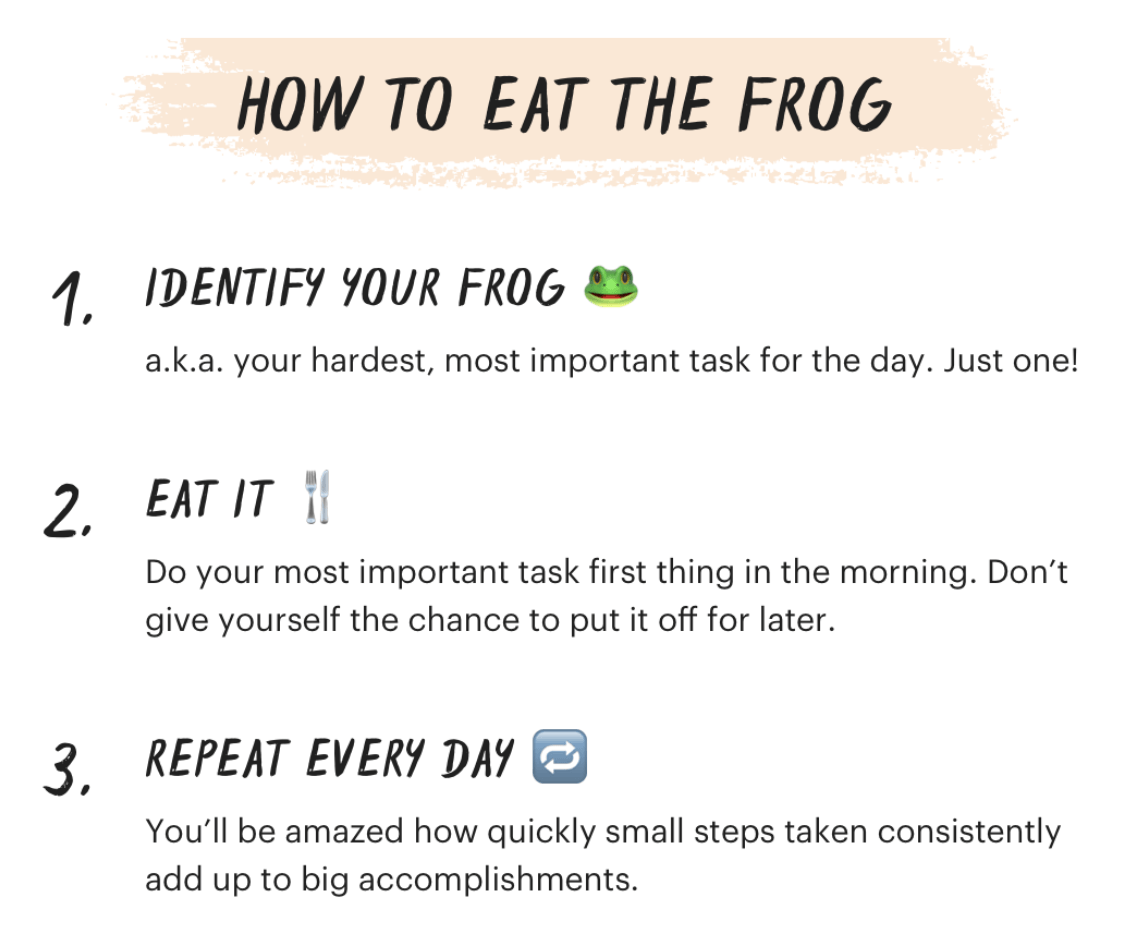 Plus, by starting off with a hard task, you are setting yourself up for success throughout your day by establishing a mindset of tackling tasks head-on instead of avoiding them.
